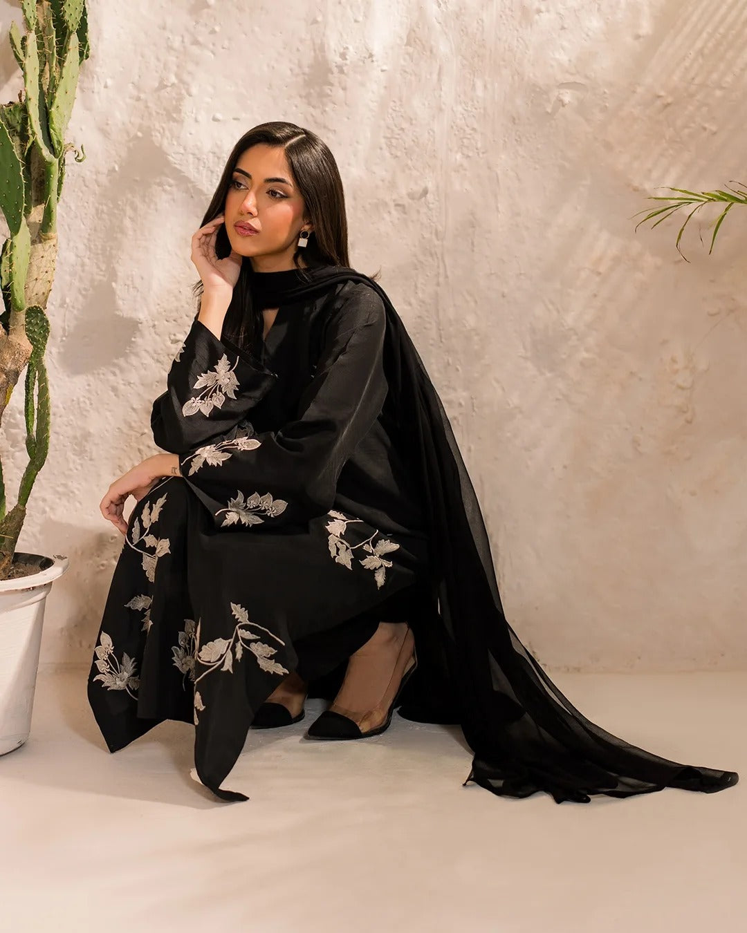 Additional Description: This exquisite Women's 3 Piece Kurta Set from Tawakal Closet is a stunning ensemble perfect for daily wear. The top is a long kurta made of cotton in elegant black, featuring intricate embroidery. Paired with a straight trouser in comfortable cotton and a chiffon dupatta, this set is ideal for summer. Stay stylish and comfortable with this chic outfit.