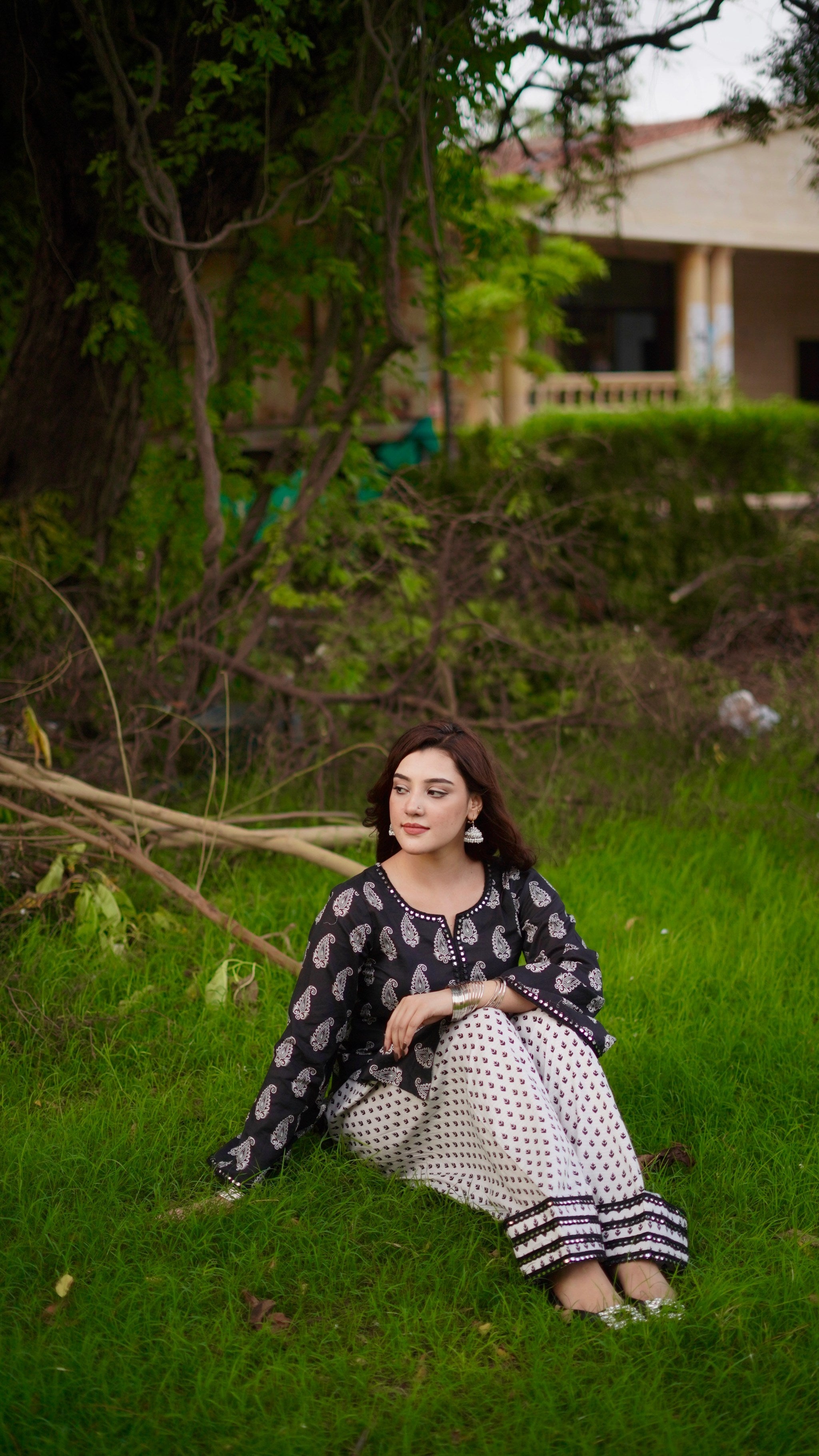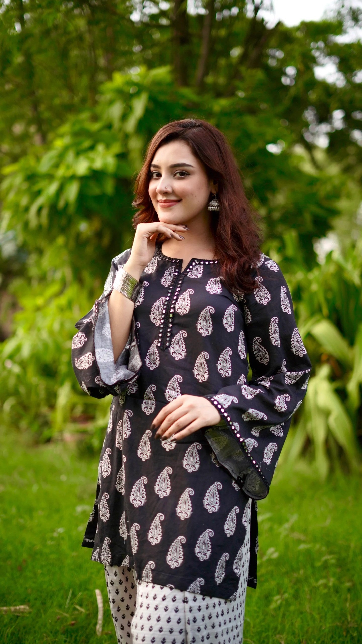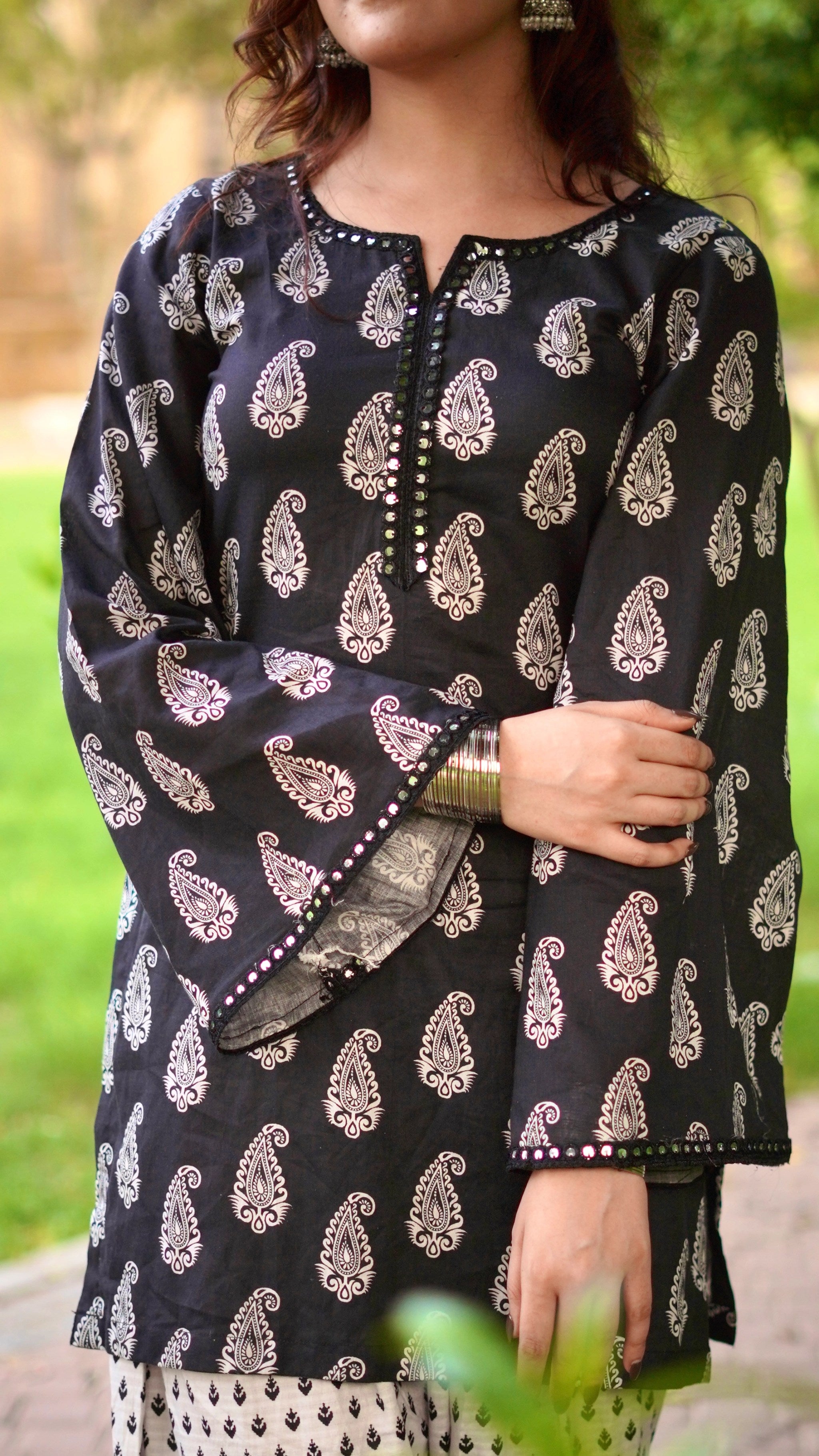 The ensemble features a chic, traditional fusion outfit perfect for casual or semi-formal wear. The shirt is a black kurti-style top adorned with a classic white paisley print. It features bell sleeves with delicate border detailing that adds a touch of elegance to the look. The neckline is a simple round shape with a slit, maintaining a graceful, modest appeal. Paired with it is a white farshi shalwar, showcasing a contrasting black and maroon block print that balances the darker tone of the shirt. The farshi shalwar is loose and flowy, offering both comfort and traditional flair, and is finished with a wide, decorative hem that complements the shirt's print without overwhelming it. The overall look is graceful, ethnic, and effortlessly stylish, perfect for day wear or festive casual occasions.