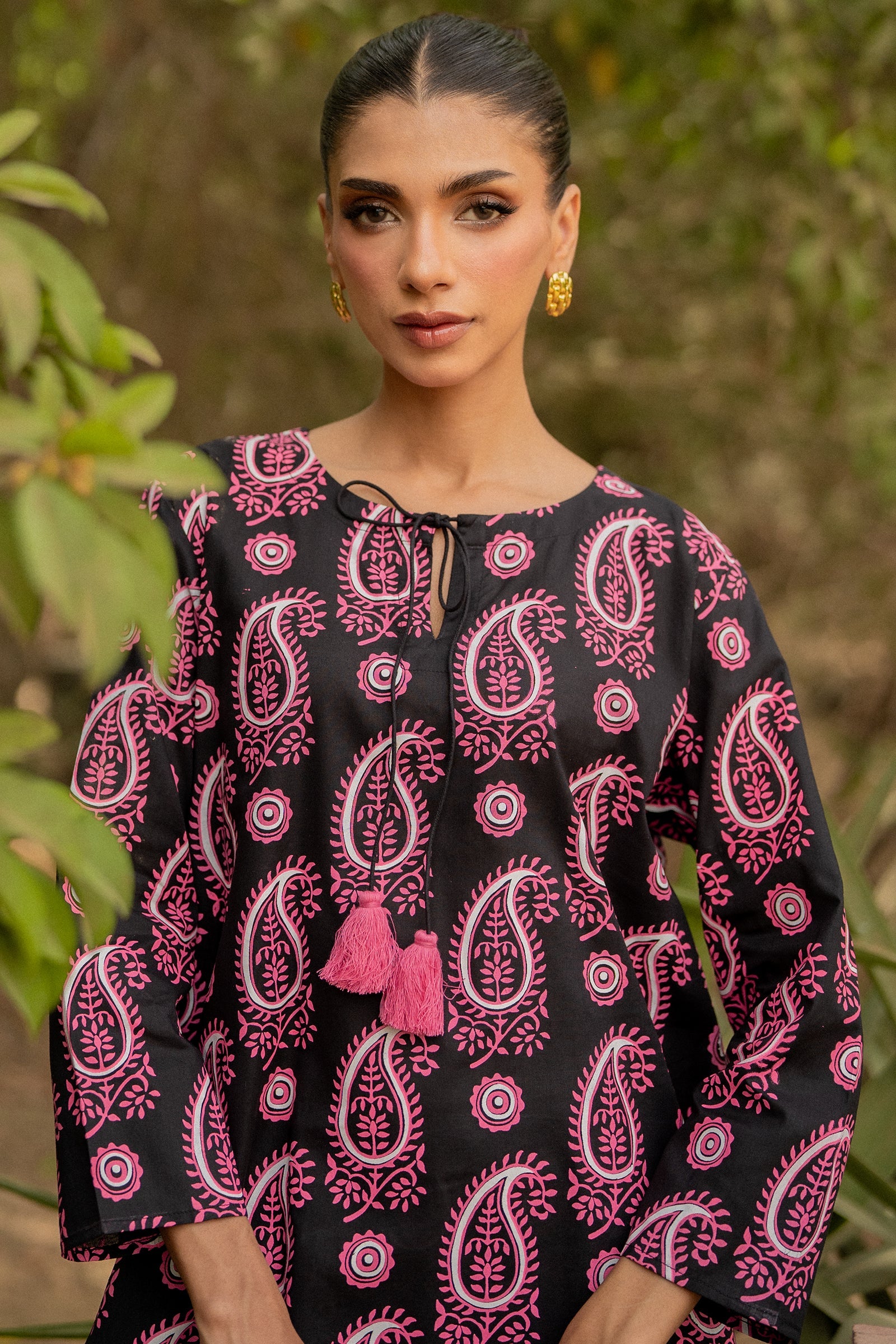 The ensemble features a chic, traditional fusion outfit perfect for casual or semi-formal wear. The shirt is a black kurti-style top adorned with a classic white paisley print. It features bell sleeves with delicate border detailing that adds a touch of elegance to the look. The neckline is a simple round shape with a slit, maintaining a graceful, modest appeal. Paired with it is a white farshi shalwar, showcasing a contrasting black and maroon block print that balances the darker tone of the shirt. The farshi shalwar is loose and flowy, offering both comfort and traditional flair, and is finished with a wide, decorative hem that complements the shirt's print without overwhelming it. The overall look is graceful, ethnic, and effortlessly stylish, perfect for day wear or festive casual occasions.