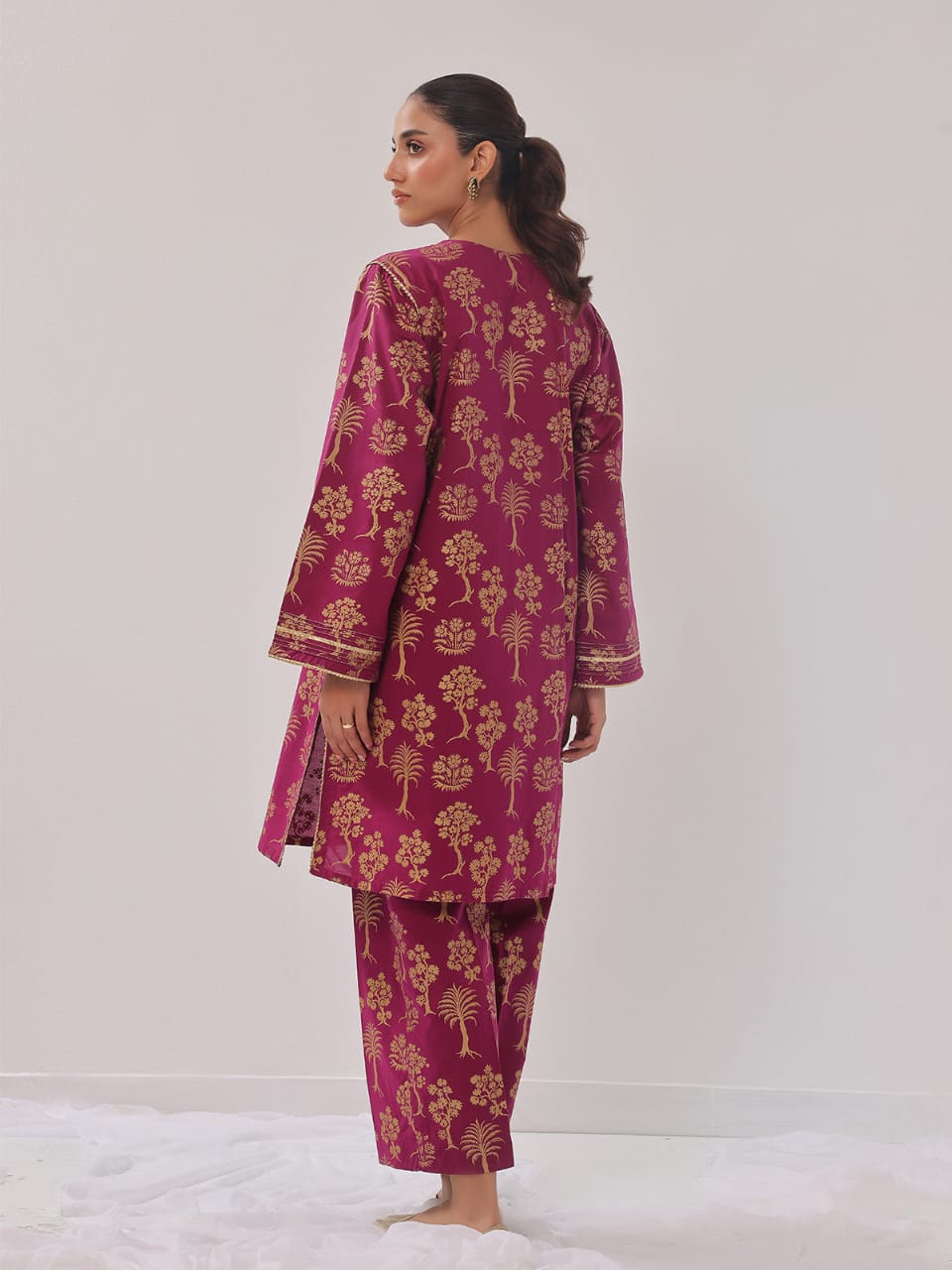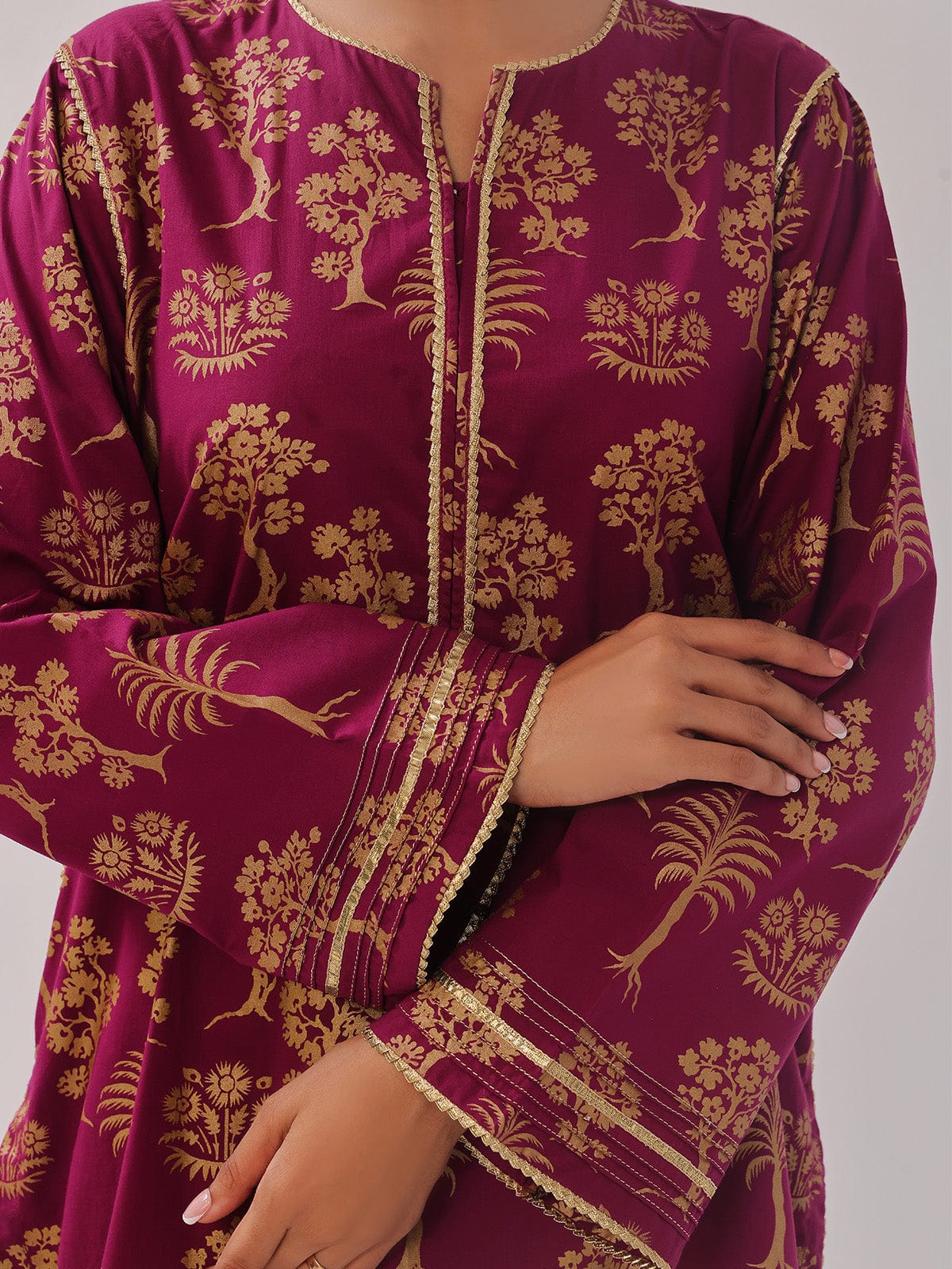 Make a statement in this show-stopping Maroon block printed look featuring tilla stitching details on neck and slits paired with pintex detailed trousers.